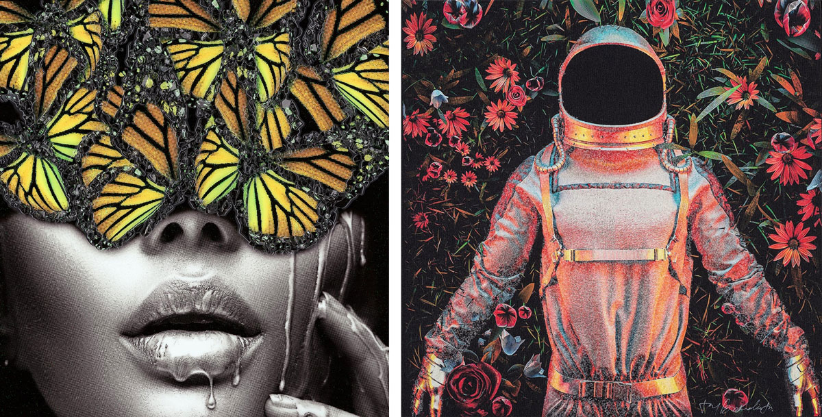 Bonadio’s artistic process starts early in the morning. He wakes up ready to create with a clear mind and builds all his frames and stretches all his canvases by hand. This is in large part because of the weight of his Neo-Mosaic glass work and heavy textures. The frames need to be built firm and with a hard board front. Once his design is stretched to the frame, he starts embellishing the art with shattered glass, 3D elements, jewelry, feathers, and more textures. Bonadio feels that the shadows, sharpness, and unique embellishments are what brings viewers into the artwork. He notes that the 3D effect often makes people want to reach out and touch his art.