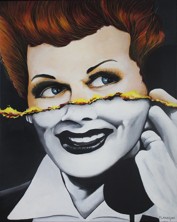 His signature “Iconography” series started as a set of black and white studies of famous sports figures. As the series progressed, Flanagan realized that we often don’t see famous celebrities as normal, everyday people. He wanted to humanize them and, by adding color to the portraits, he achieved this aesthetic. This eventually evolved into incorporating specific colors and hues to highlight various traits, whether humorously or wryly.