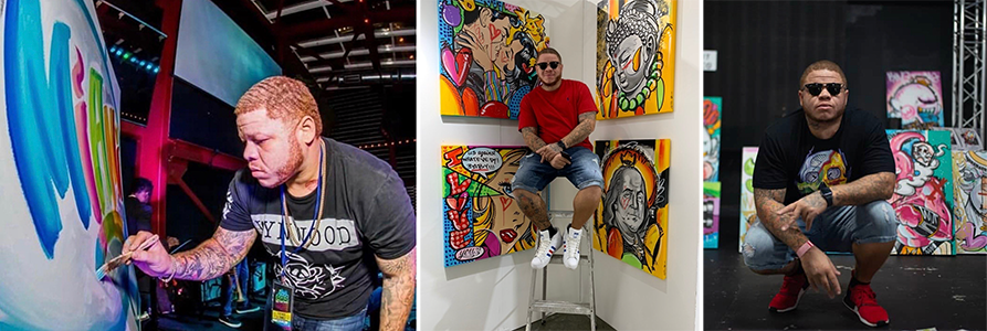 READ MORE +Redd is a self-taught artist who is continually developing his own unique artistic style through trial and error, trying new techniques, and a relentless drive to be a phenomenal and memorable figure in the modern art world. His process as far as creating a work of art is first to think of what he wants to convey and what would be the most attractive way to get that message across to the viewer. Then he scours through old cartoons, retro visual art, and ultimately begins the process of creating something new with a fragment from the past. Redd looks for context and references in older images and stories, believing that they hold more resonance when trying to convey a message that should be valued today. There’s a graffiti edge and vintage photography incorporated into his art too. He doesn’t quite yet know what to call it but he’s carving an exciting new path mixing the old with the new. The results are nothing short of astounding, a unique style of modern art that is akin to a colorful explosion of human emotion and vivid memories.