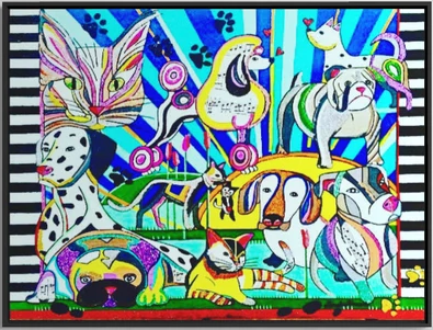 Linda Himeur is a contemporary mixed media artist whose work is a vibrant celebration of life that expresses the full range of human emotion and captures the immense beauty in the world. Her colorful, original art features abstract representations of animals and enigmatic faces, with glitz and glam through mixed media serving as integral elements of each work of art.