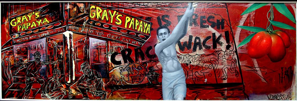 A protégé of Andy Warhol’s illustrious studio collaborator Ronnie Cutrone, Paredes early on made his name as a graffiti writer in his native New York, then made the transition to establishing himself as a Pop artist with his own eye-catching graphic style that delivers sexy characters and action figures in vibrant colors and crisp outlines. You can see the graffiti foundation in such paintings as Love Story, where he imitates the effects of spray paint on city walls with just a touch of reference to such artists as Haring and Banksy. He is best known for his take on the Japanese anime aesthetic, including the voluptuous girls with their come-hither looks and martial arts fighters who burst into action. These irresistible characters include Pulgha, a magical flea, and her friends, who have been turned into a branded, animated sit-com series. Paredes has an appetite for cutting-edge innovations in materials and media, moving easily between the painter’s easel, the illustrator’s desk, the animator’s screen and the sculpture studio.