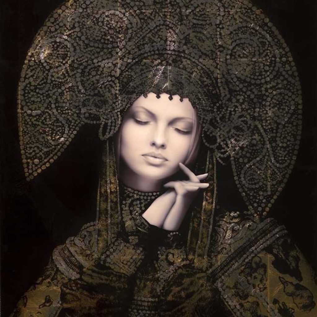 Adding to his combined style of glazing and guilding, Guyton furthers his approach to color and method in his new self-titled “Nouveau Chimique” style and series. In this style, chemical concoctions on copper leaf are used to induce a forced patina in turn using the natural eremacausis of nature to colorize the substrate prior to the application of the actual artwork.