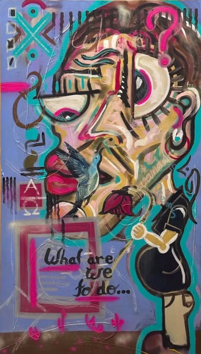 Most of Mason’s early art was craft-based and sculptural. As he started to travel, the artist soon realized the longer he was away from his tools, the bigger the void in his heart would grow. To fill this creativity gap, he started painting more as the tools and materials needed to paint are more compact and transportable. He took major influence from Pablo Picasso, Salvador Dali, Kandinsky, Michelangelo, and da Vinci. He picked up motifs from each of them, whether it be sourcing material from nature itself, trading art, integrating, technology, pushing absurdity, or abstraction.