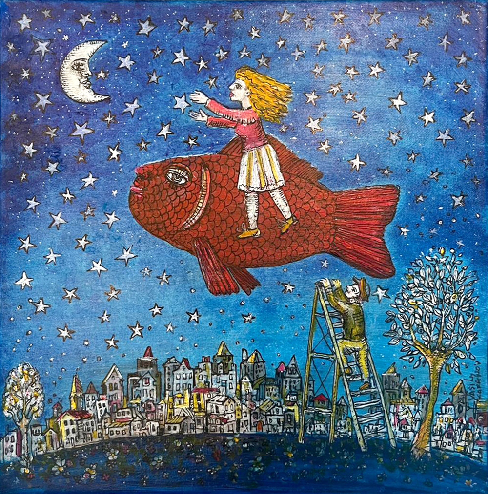 The artistic style of Vasily Kafanov is a blend of surrealism and symbolism, heavily influenced by the artist’s exposure to Commedia dell’Arte and the works of Hieronymus Bosch and Pieter Bruegel. The use of fish as a central motif in his work is tied to a fascination with alchemy and transformation, themes that resonate throughout his illustrious career. The works of Marc Chagall also had a significant impact on Kafanov, especially in his earlier years. While his style has evolved over the decades, it remains rooted in these early influences, combined with a deep appreciation for the mysteries of the world, both seen and unseen.