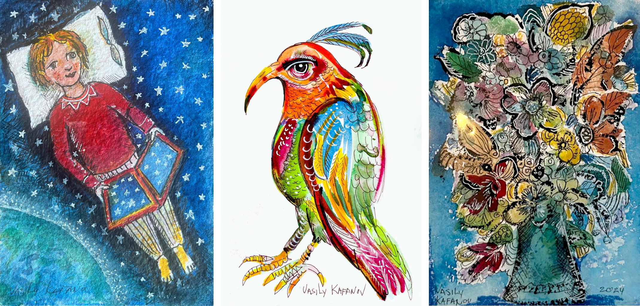 When not painting, Kafanov loves traveling and exploring new cultures, with a particular fondness for visiting places rich in history and artistic heritage, and is passionate about collecting antiques and unusual objects.