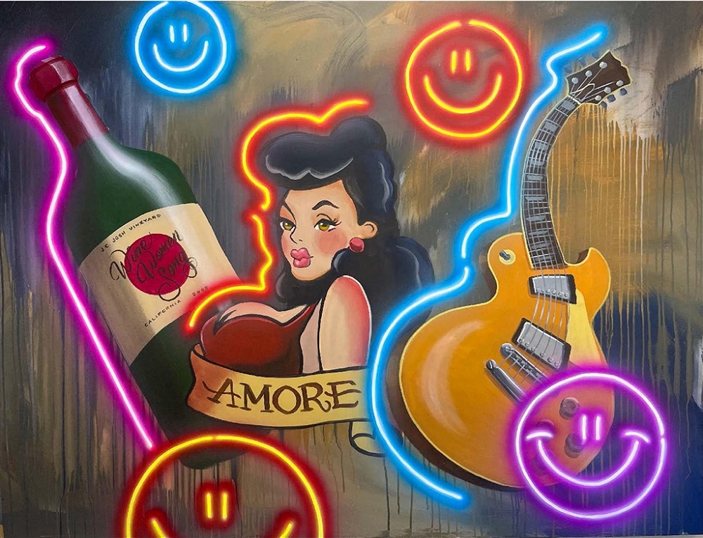 In Las Vegas, Ziggy has found his home in the city’s thriving downtown Arts District. He’s influenced by all things Vegas—street art, murals, architecture, and the glow of the city’s vintage neon signs—and those characteristics both inform and inspire his singular artistic vision. The other inspirations for his imagery can be found in his love of music, guitars, movies, and pop culture.