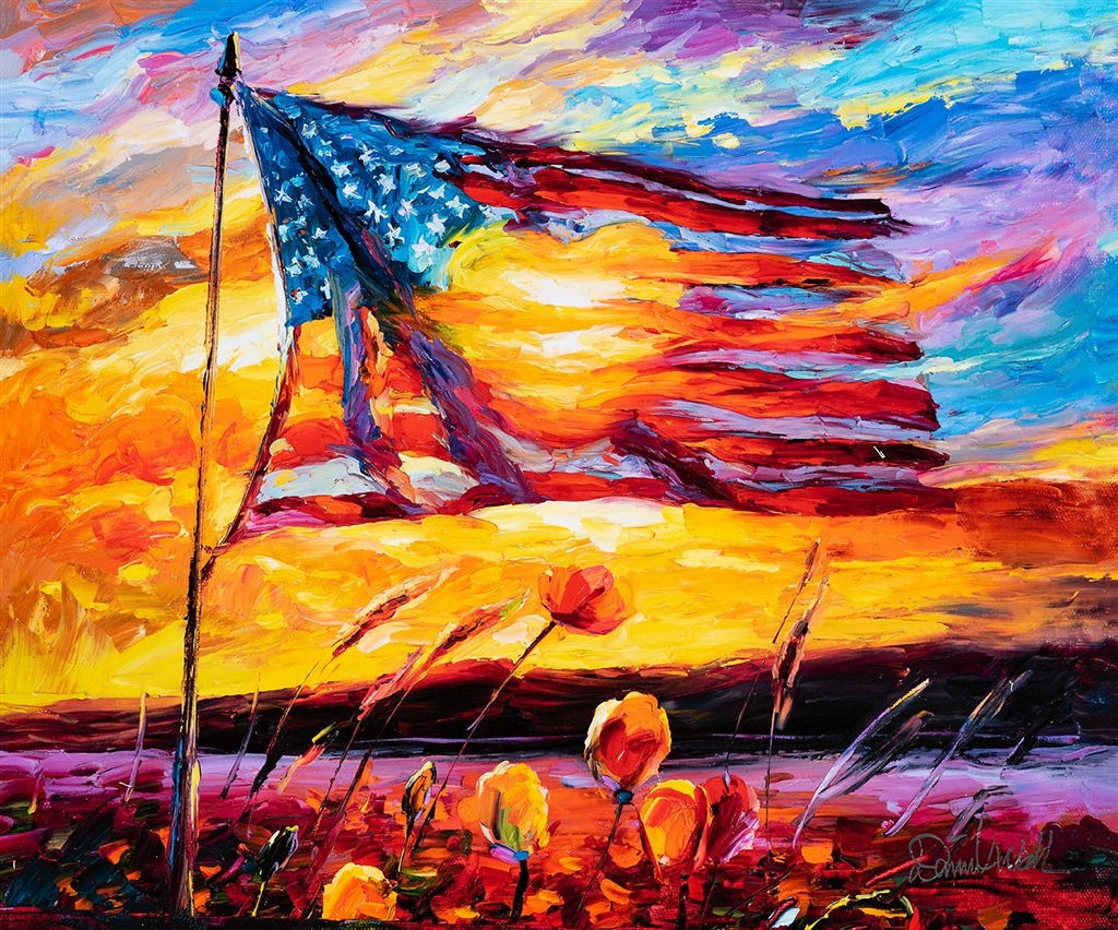 Amber waves of grain, twilight’s last gleaming, and the proof through the night that our flag was still there — Daniel Wall’s remarkable painting, “The American Dream,” is a warm, evocative dreamscape that honors both the flag, its proud history, and the heart literally at the center of the country it represents. This work is extremely special because even in fractious times, the American flag, as Wall envisions it, is capable of bringing us together and helping us honor fallen heroes on Memorial Day and every day after. We can’t imagine a better use of immense artistic talent than that.