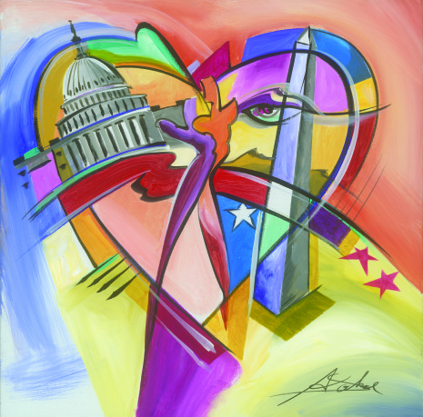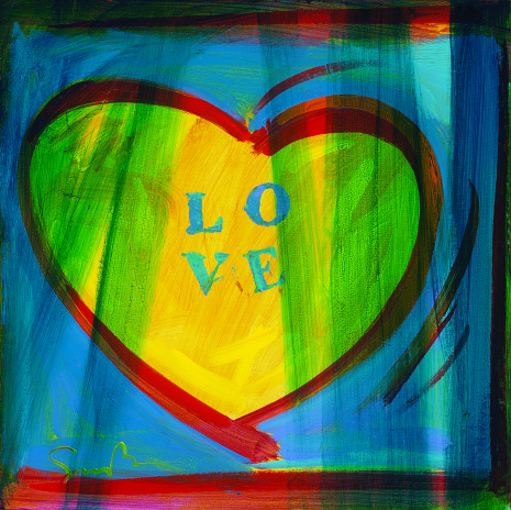 Aside from his rich and vibrant flower paintings, an oft-used motif for Simon Bull is the heart. The English-born artist uses bold colors and a gestural painting style, and brings out feelings of patriotism with his combination of hearts and the U.S. flag.