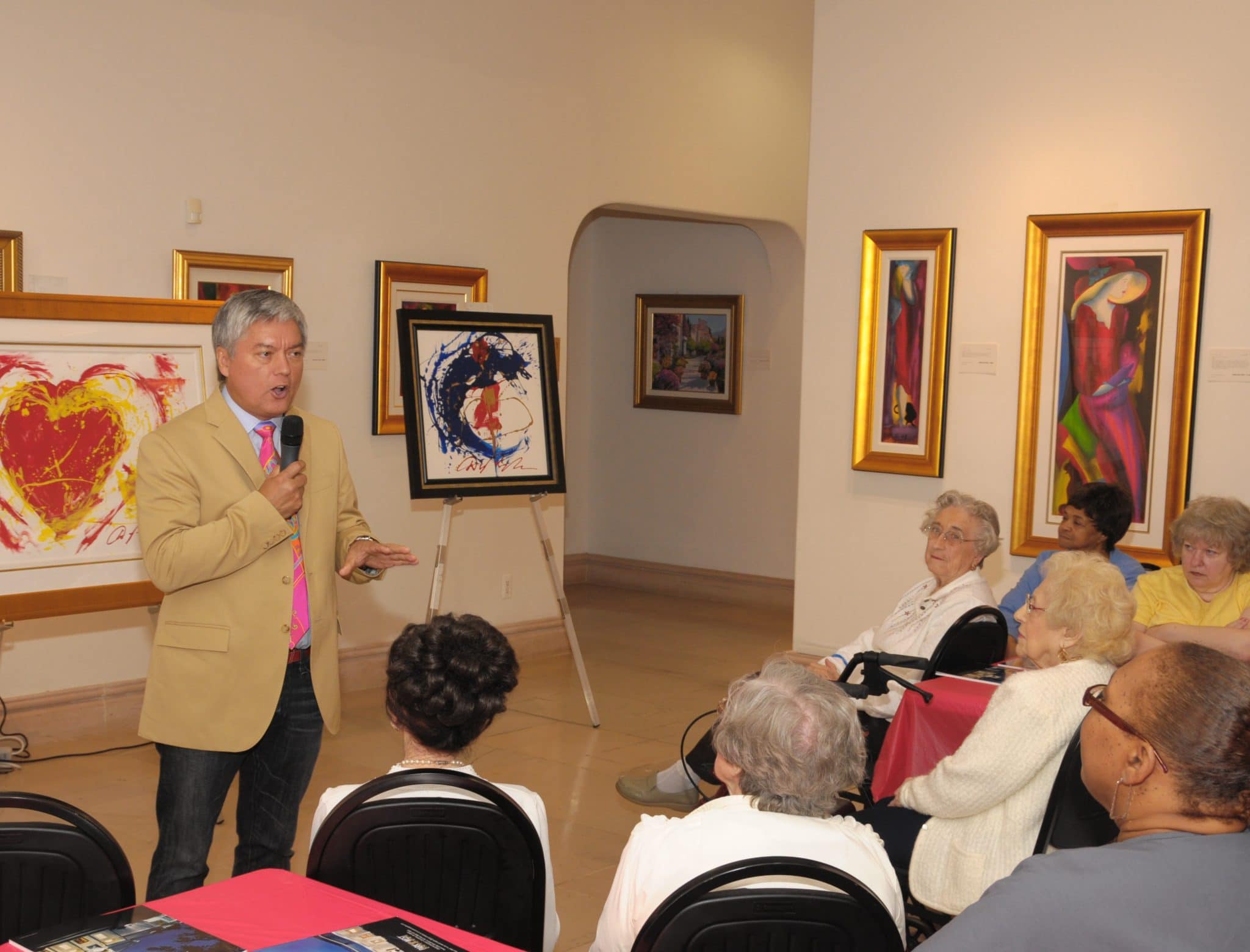 The American House residents were surprised and elated when Pangborn presented each of them with one of his signature scarves and ties. Park West Gallery also gave every guest a small work of art to take home as a souvenir from the event.dominic pangborn, park west gallery, american house