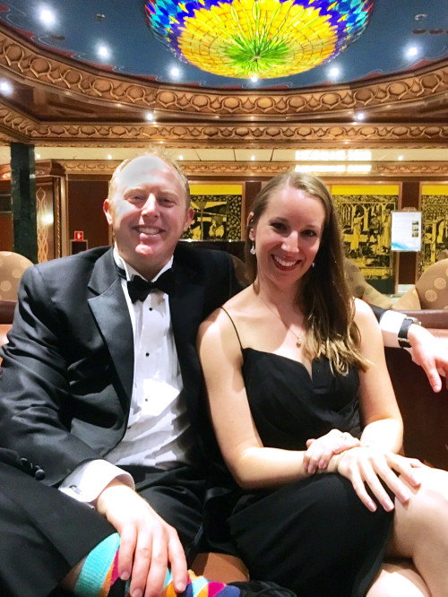 William Roberts and Justine Covey dressed to the nines on Carnival Spirit, one of the many ships they’ve been auctioneers on. Photo credit: Justine Covey