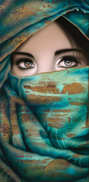 Guyton enjoys depicting mysterious women covered in elegant, flowing fabrics, often revealing a pair of striking eyes and little more. These figurative works are so special that he only creates about 10 to 12 a year.