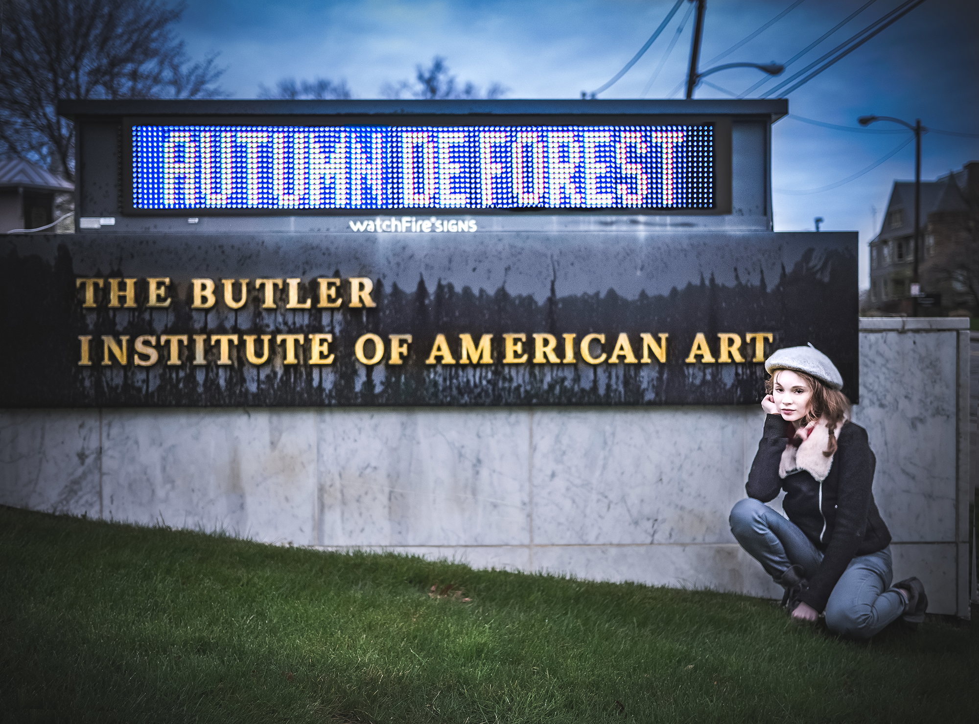 Autumn takes a moment to pose with the Butler Institute of American Art’s sign. (Photo credit: Doug de Forest)
