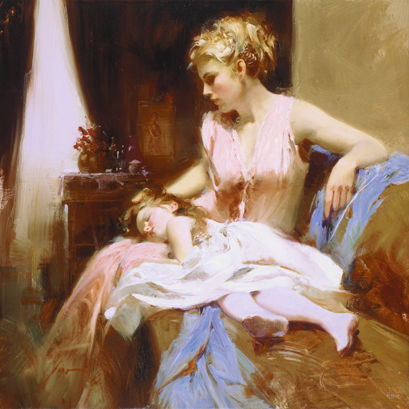 Pino grew up in Italy surrounded by women – whether it was sisters, aunts or his mother – and in turn, he recognized their physical and spiritual beauty. Pino illustrated sensual, attractive women on book covers, but switched to creating works of fine art in the early 1990s. For Mother’s Day, examine how his mastery of technique and figure portrays the loving care of a mother with her child.