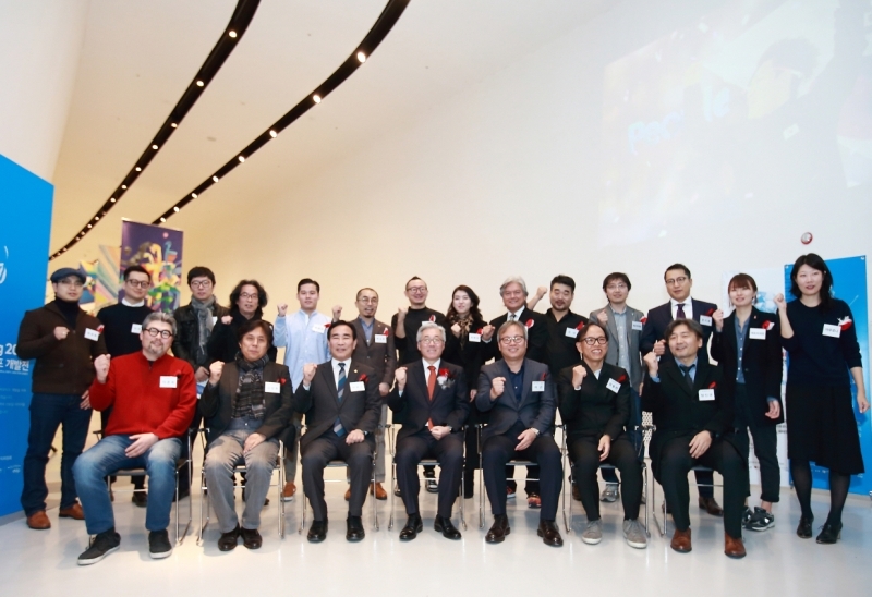 The 14 artists (back row) and 2018 Winter Olympics officials. Pangborn is the sixth artist from the right. (Photo courtesy of pyeongchang2018.com)