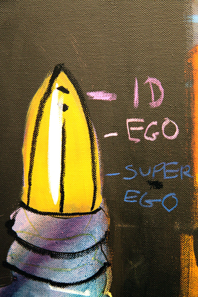 In the minotaur’s hand is a dagger with the terms “id,” “ego” and “super ego” written next to it. These terms are how Sigmund Freud defined the human psyche, and what Lebo says is “an explanation for what makes us who we are.”