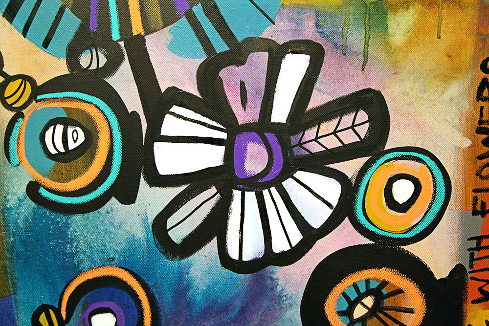 On the right side of the painting is what Lebo says can be interpreted as a universe, life forms under a microscope, or as the painting’s title suggests, a still life of flowers.
