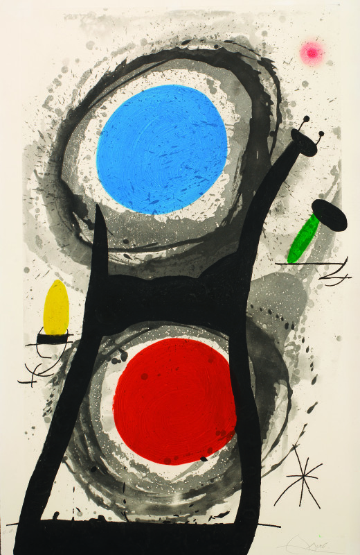 In the mid-1940s Miro returned to his homeland of Spain and began to experiment with many forms of media including lithography, etching, ceramics, sculpture and murals. He became one of the most prolific creators of original lithographs and etchings and innovated the techniques of etching through the use of highly textured applications of color, a technique that would later be called carborundum aquatint.
