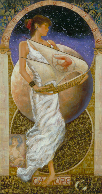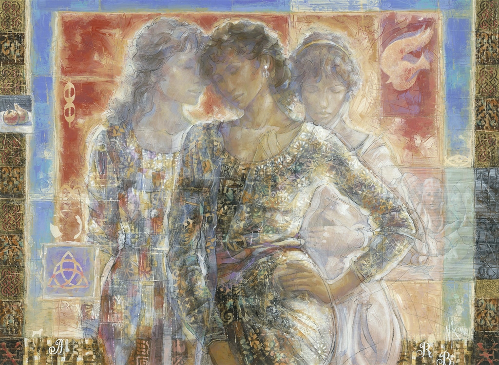 Nixon’s art is breathtaking and ethereal. His unique “Sketch Style” combines a form of Cubism with working alterations left visible in the picture, and is influenced by artists such as Titian and Sandro Botticelli. To pay homage to these artistic giants, Nixon masterfully creates airy vignettes of these masterworks within his art, overlaying them over timeless goddesses.