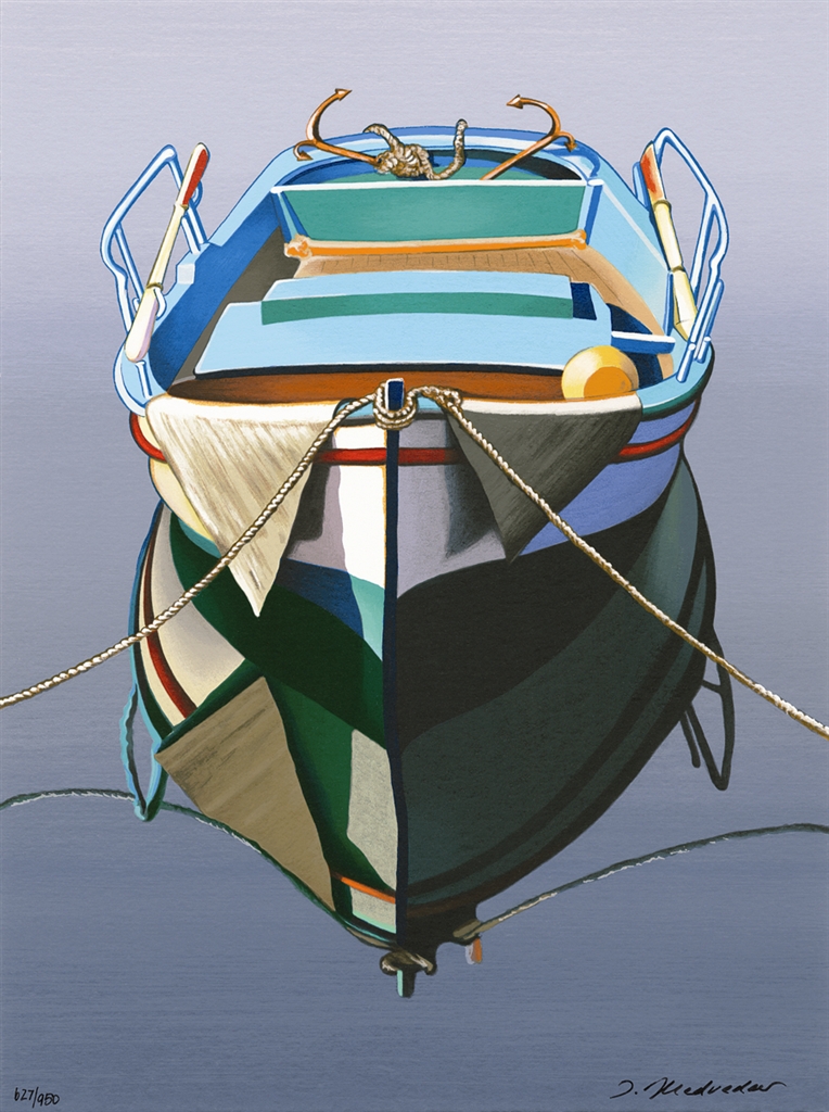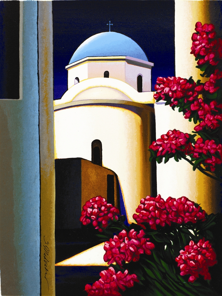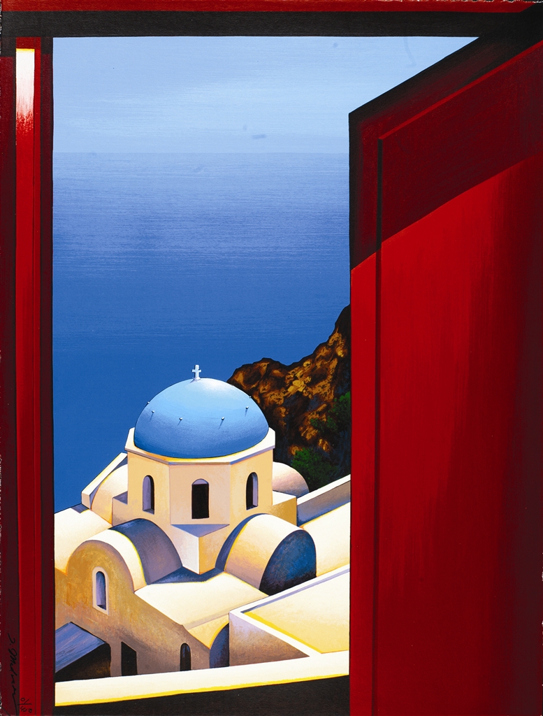 During the 1980s, Medvedev and his wife Marina traveled throughout the Mediterranean. Greek landscapes and blissful water scenes, in particular, spoke to him as he became fascinated by the dramatic vaults and domes of Cycladic architecture. You can see this today in many of Medvedev’s most colorful and visually stunning works from his time spent on the Greek isles.