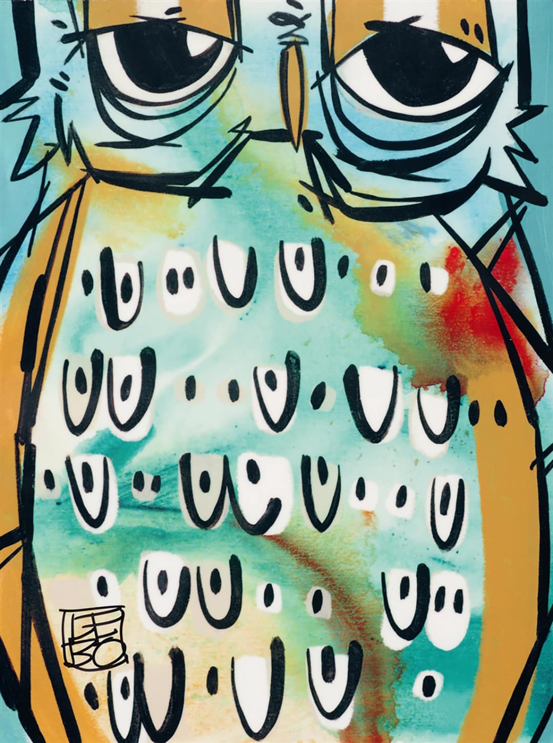 LEBO: This is almost a study in minimalism. The figure of the owl is more of an icon than anything. It’s a totem, a symbol. If I ever created my own comic strip, I could see an owl like this as a central character. Owls are one of the major recurring visual motifs in my works. Owls can see in darkness, so they represent a kind of light in the darkness. The owl allows us to see ourselves in that role—we are the light, we are our own light in the darkness.