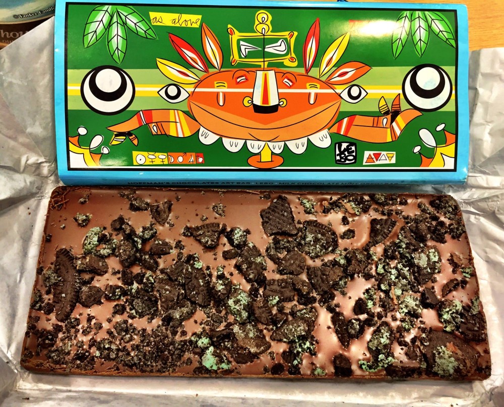 The artwork on the wrapper, called “The Bliss of Balance,” is about humans searching for truth and wisdom by investigating the natural world. A poster of the artwork is included with every bar purchased.