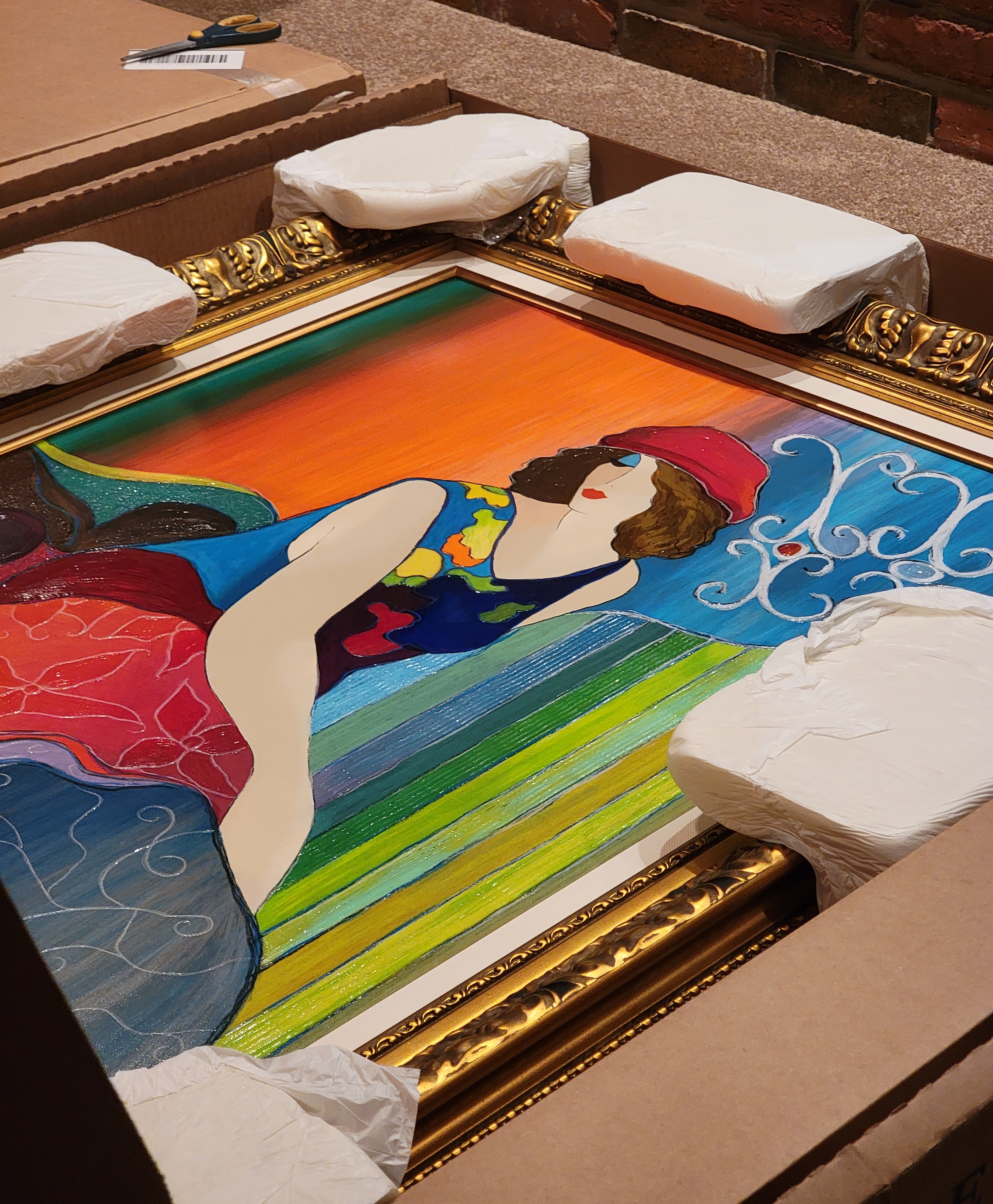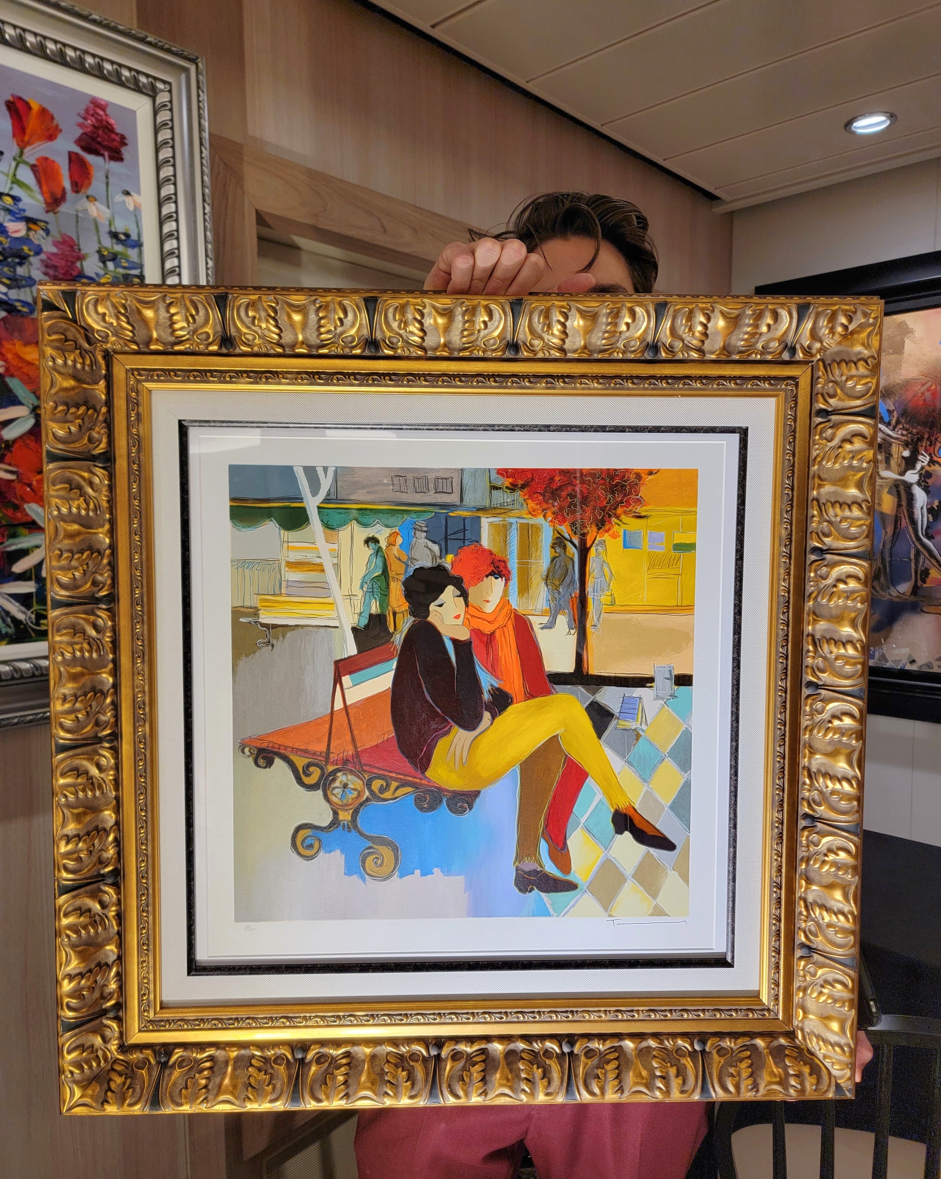 In the living room will go “Colorful Pose,” the bright, bold, and vibrant Tarkay hand-embellished serigraph on canvas that started the couple on this art collecting journey. It will hang beside “Cozy Bench for Two,” with its glass protection warding off curious kitty cat claws, beneath “Joanna,” the 10×10 masterpiece Jeff first fell in love with after reading this story about Itzchak Tarkay.