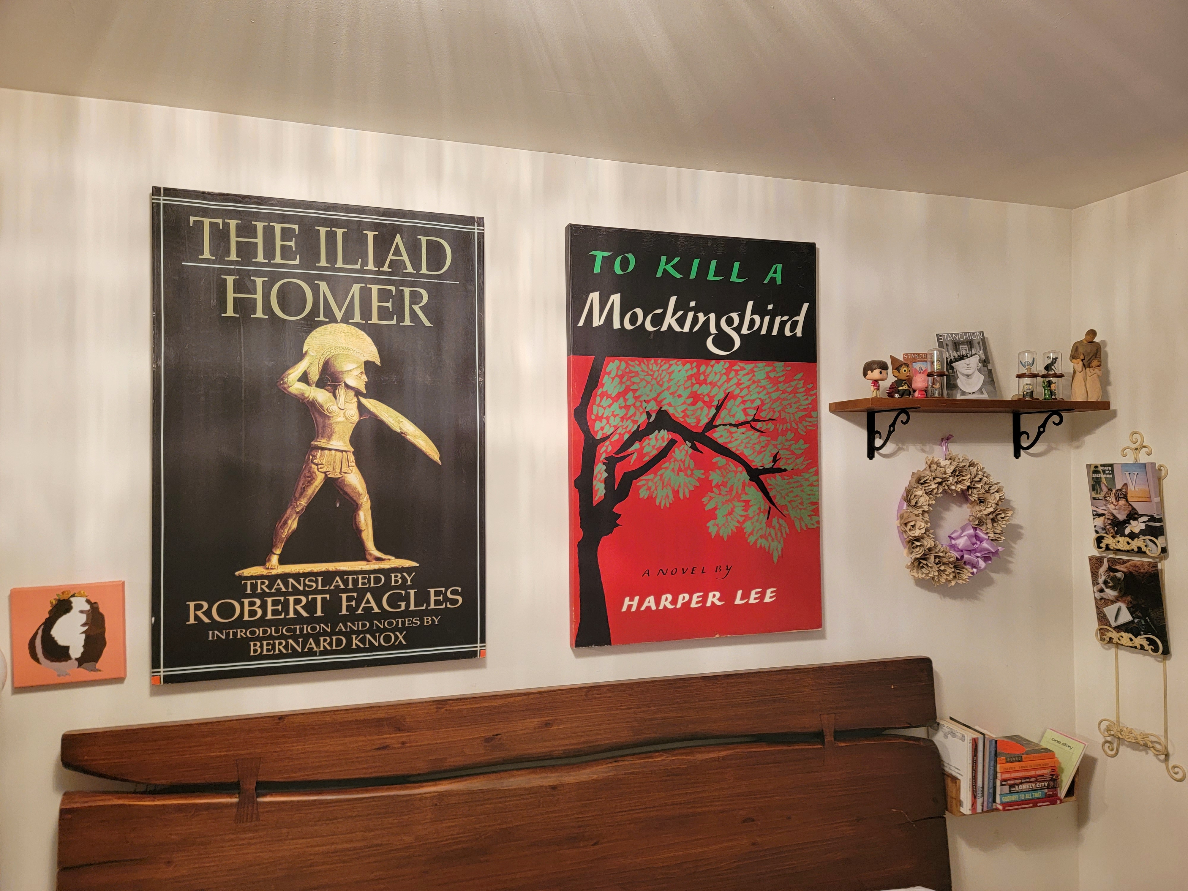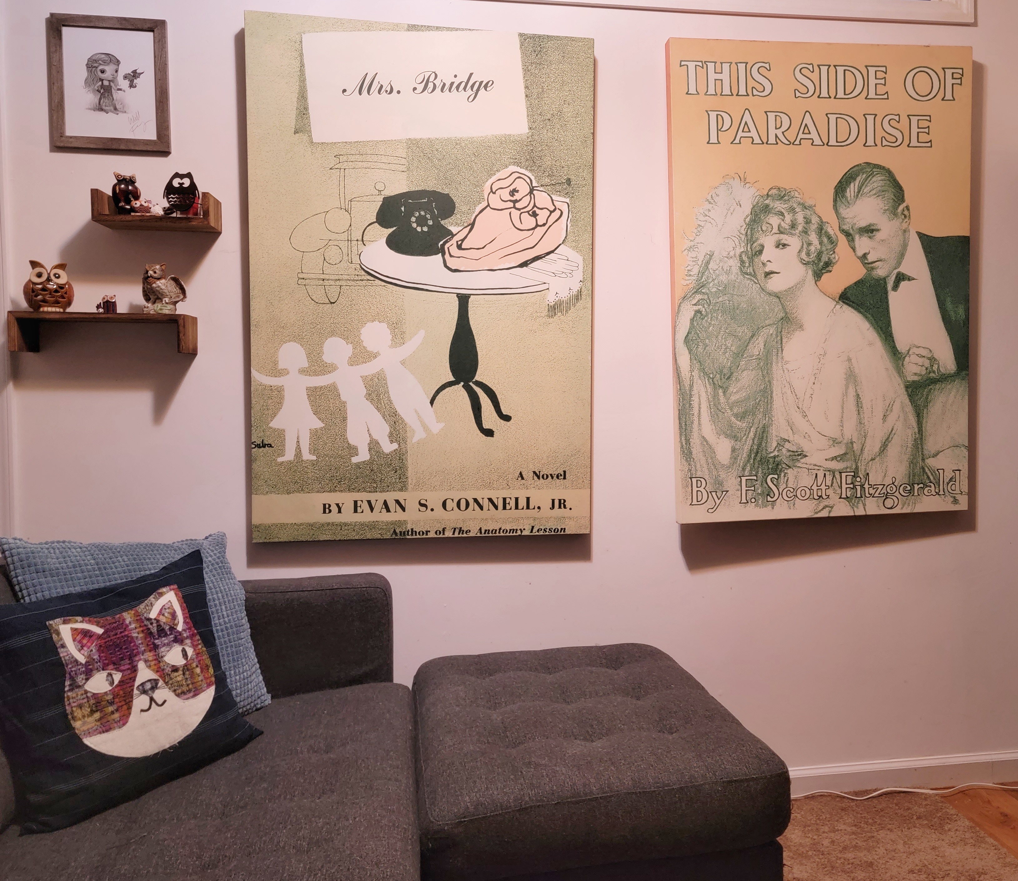 The decision was finally made to remove four book-art canvases—two each from the bedroom and living room. Above the dark wood headboard in the bedroom will hang Itzchak Tarkay’s “Autumn in the Country,” while the To Kill A Mocking Bird canvas—with its thematically appropriate tree image and deep red and black design—moves left to hang above Lorelei’s chest of drawers.