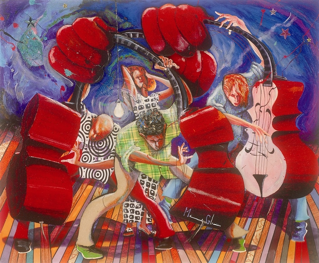 Collectors love how Glenn borrows various artistic elements—everything from Cubism to illustration—and reinterprets them like a jazz ensemble, creating his own unique visual style.