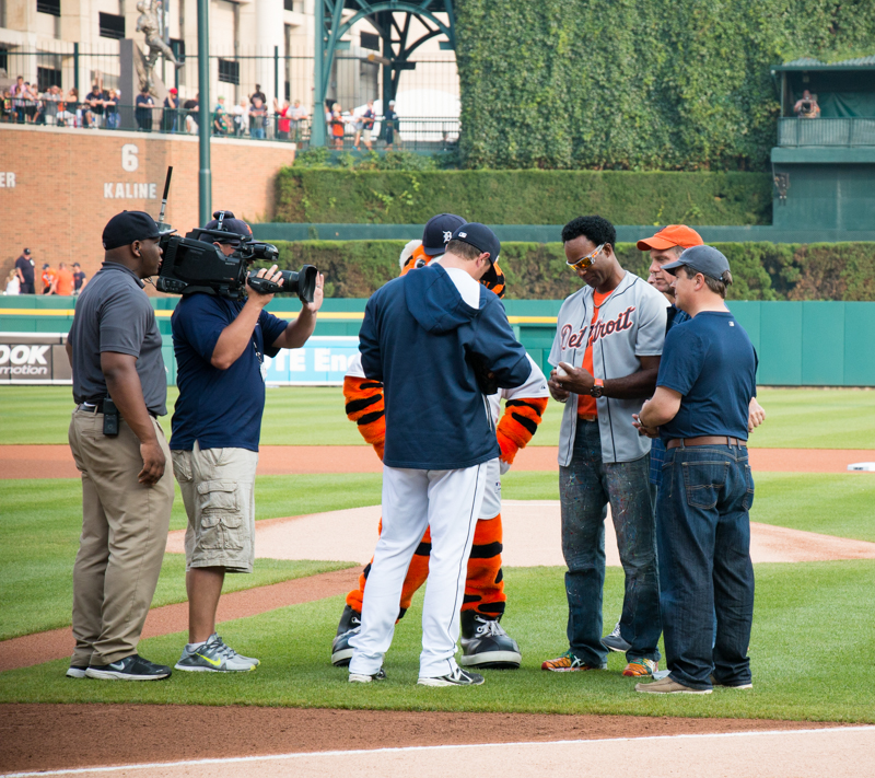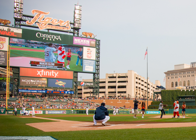 Marcus Glenn took the mound at the home of the Detroit Tigers – Comerica Park – for a ceremonial first pitch at Friday night’s game against the Colorado Rockies. The official artist of the 56th Annual Grammy Awards and Park West collector favorite jumped at the invitation and enjoyed every minute of the experience.