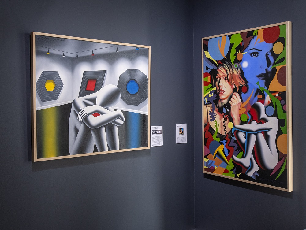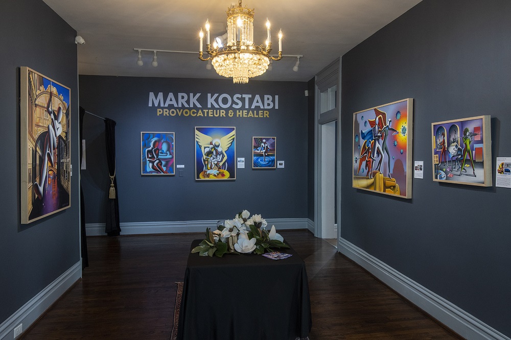 “Mark Kostabi: Provocateur & Healer” featured 42 paintings, all created in the 21st century, by the internationally recognized artist who was one of the key players in New York’s East Village art scene of the 1980s. As a young artist, Kostabi took his cues from Andy Warhol, whose “Factory” was a prototype for making art according to a business model.