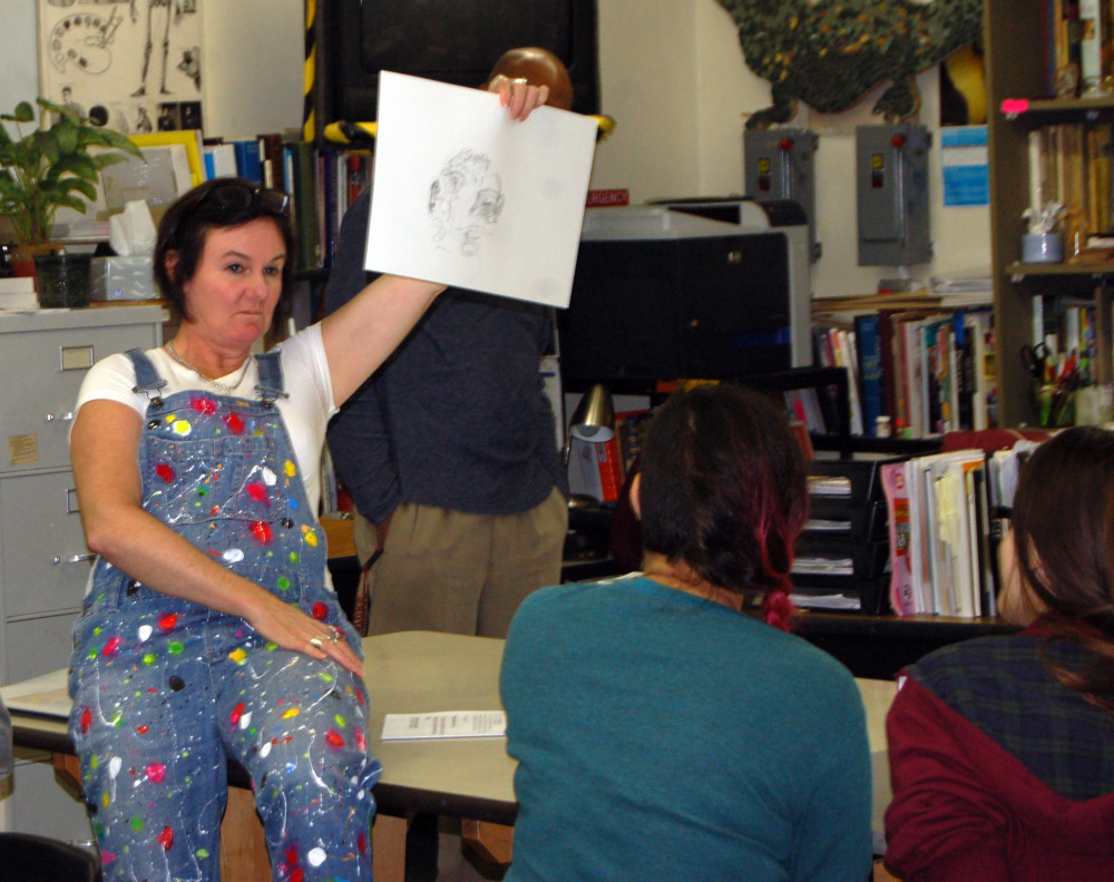 Sharam guided the students through two drawing exercises to help them expand their imaginations and creativity. They closed their eyes and drew self portraits, while another session had them draw a still life without looking at their paper.