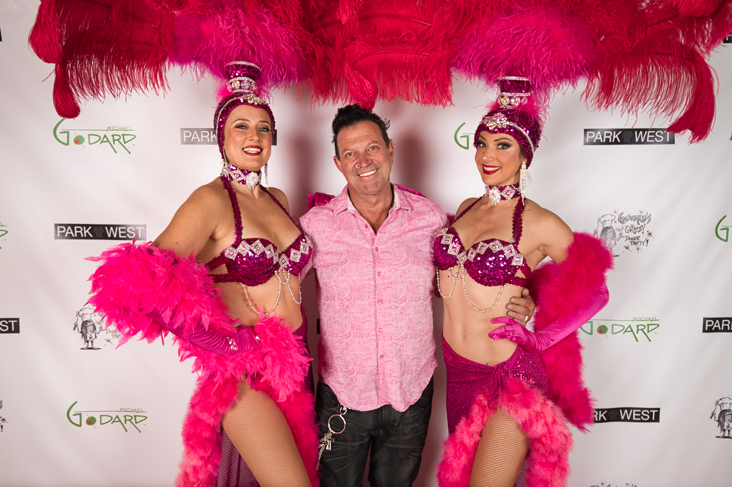 Michael Godard posts with showgirls at Godard’s Crazy Dinner Party