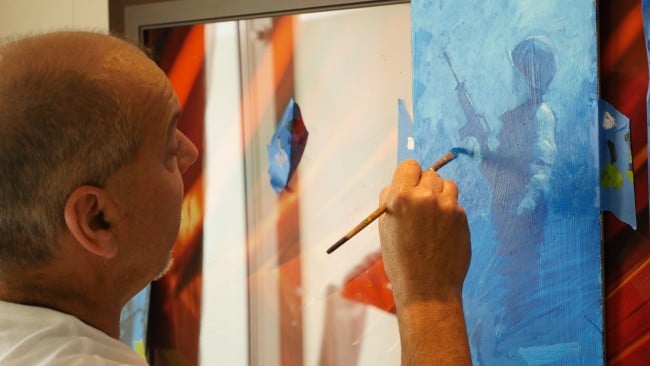 Marko Mavrovich paints a soldier with a military dog.
