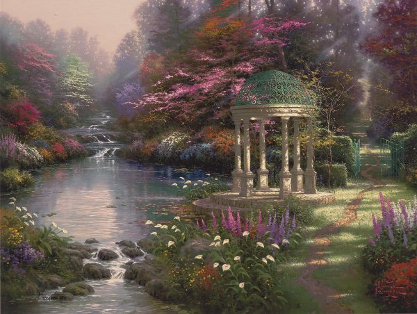 This ethereal garden paradise is Kinkade’s first depiction of calla lilies in a painting, which are used to celebrate Easter. With a gentle stream forming seven pools, a beautiful stone monument, and a rainbow of flora, Kinkade said his hope was to create a painting that serves as a “meeting place for many that would speak to their God in the silence of morning.”