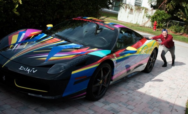 This isn’t the first high-performance auto the Park West painter has wrapped with his signature style, he’s also created art for a Ferrari FF that’s in production now and this Ferrari 458 Italia, below.