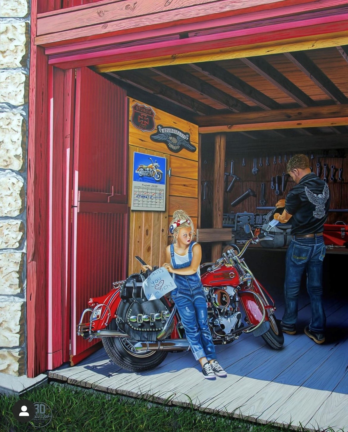 “She’s leaning against her dad’s bike, opening up the saddlebag, and she’s putting a note in it that says, ‘I’ll miss you so much,’” Jacobs describes. In the background, the dad can be seen in his workshop packing to go on a trip. Jacobs notes that, “The last thing he’s putting in his bag was a mask, because 2020 was the COVID year. And so he’s putting this mask in the bag and then there’s a calendar on the wall with dates crossed off that indicate next week is the Sturgis Motorcycle Rally.