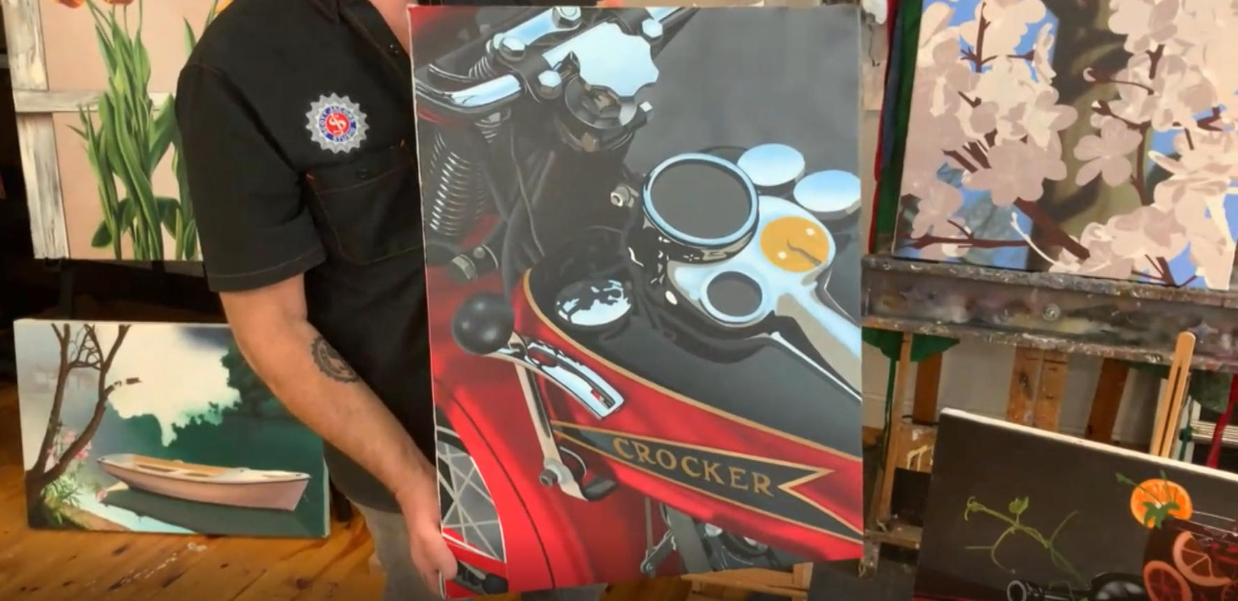 Jacobs shows off an unfinished Harley-Davidson-inspired painting.