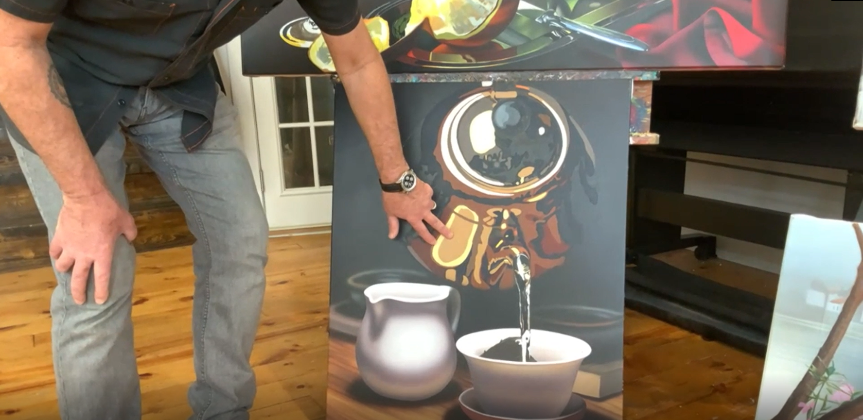 Scott Jacobs shows Park West’s online collectors his work-in-progress paintings.