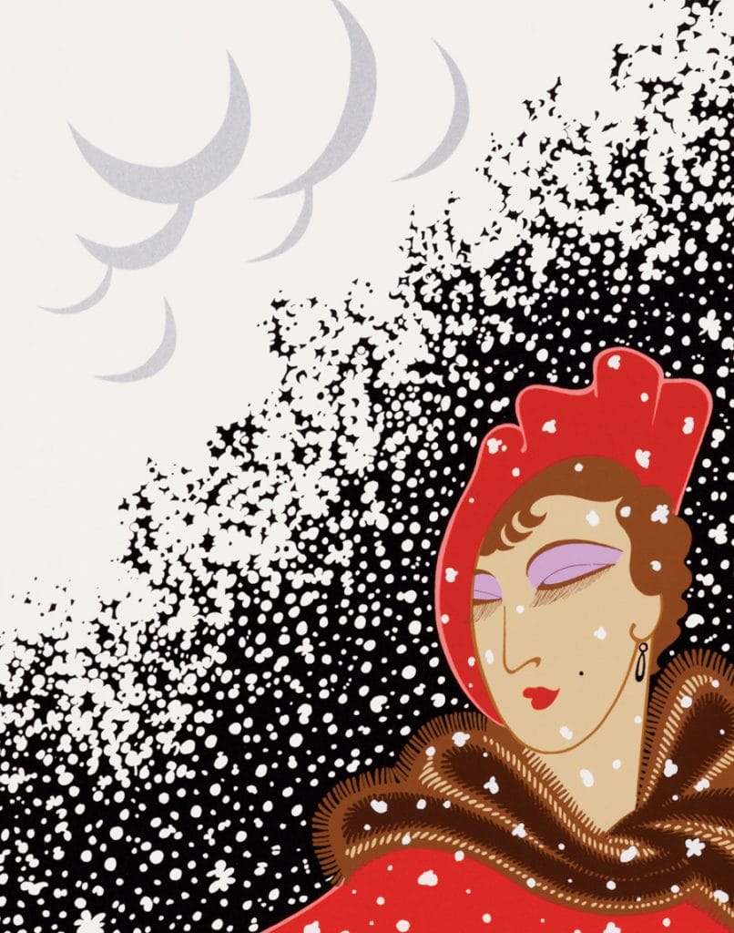 Perhaps the most fabulous take on winter comes from renowned fashion illustrator Erté. The Russian-born artist is credited as one of the founders the Art Deco movement—a style of art that embraced luxury and glamor. The woman in “Winter” embodies this motif as the subject’s red coat and fur scarf stand out from the black background and white snow.