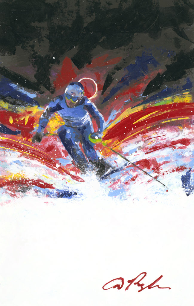 As a dynamic artist, Dominic Pangborn‘s wintery interpretation takes a different approach to a classic snow-covered scene. Pangborn’s “Full Speed” brings a burst of color  contrasting with the snowy ground as the skier races down the mountain.